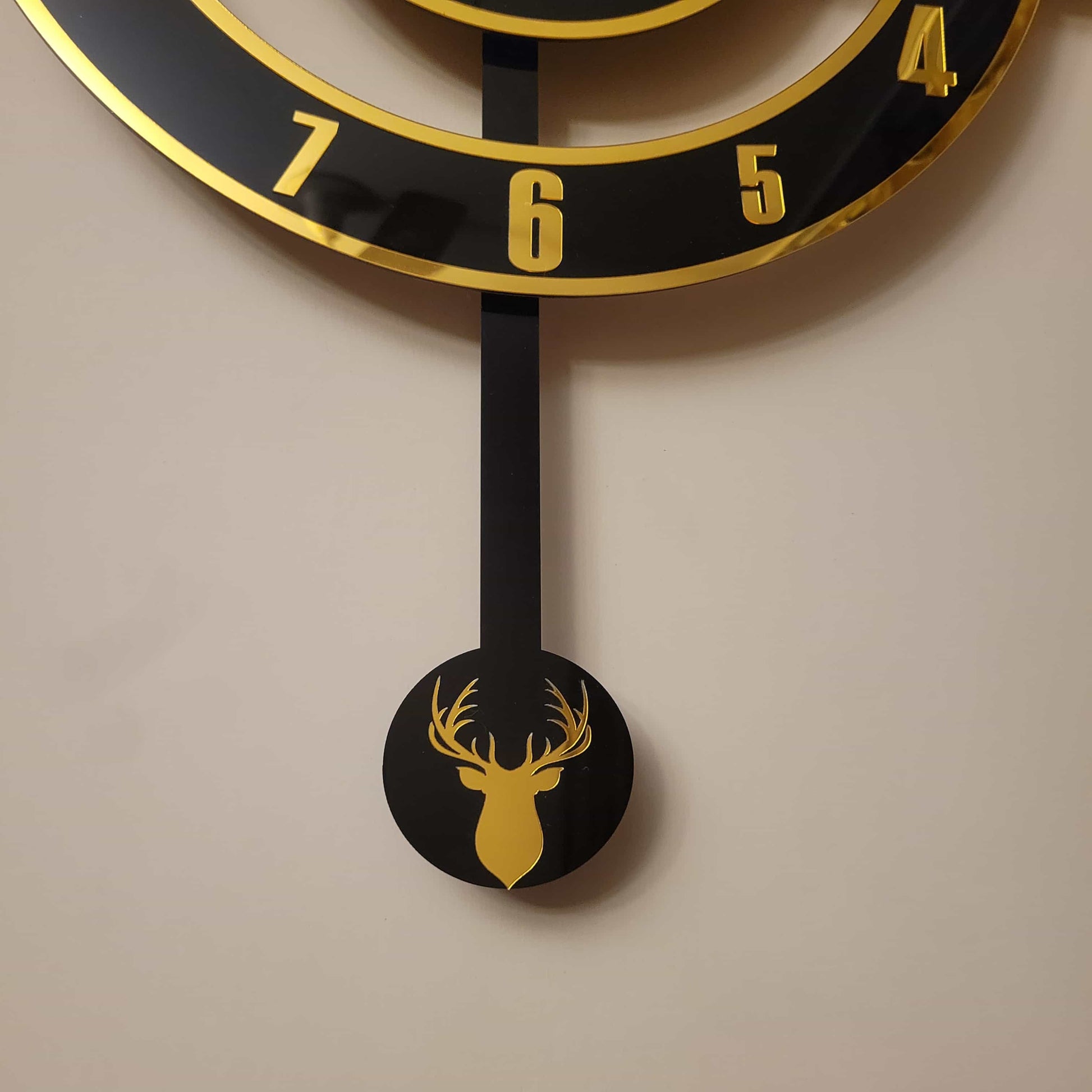 Enhance your space with this Modern Dual-Layer Acrylic Pendulum Wall Clock, a perfect blend of elegance and contemporary style. Crafted with a black acrylic base and a golden acrylic front, this 16-inch timepiece stands out as a statement décor piece. Featuring a pendulum adorned with a stunning deer horn design, it adds a touch of nature-inspired sophistication to your home or office. The smooth-swinging pendulum and high-precision mechanism ensure both beauty and functionality.